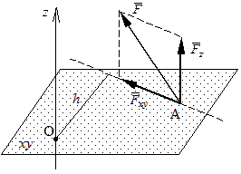 Пусть на твердое тело, которое может вращаться относительно некоторой оси z, действует сила F, приложенная в точке A. Проведем через точку A плоскость xy, перпендикулярную оси z, и разложим силу F на составляющие: Fz, параллельную оси z, и Fxy, лежащую в плоскости xy. Сила Fz параллельна оси и не может повернуть тело относительно нее. Весь вращательной эффект от силы F будет совпадать с вращательным эффектом ее составляющей Fxy. Отсюда получим, что