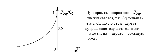 Барьерная ёмкость Сбар проявляется в результате изменения заряда ионов донорной и акцепторной примесей, которые образуют как бы две обкладки “конденсатора“, при изменении напряжения на переходе: