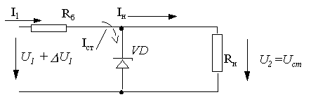 Применяются в схеме параметрического стабилизатора напряжения параллельного типа: приращение напряжения питания D U1 падает на балластном резисторе Rб, а выходное U2 остаётся неизменным.