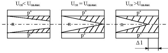 Если на канале есть напряжение Ucи, то разность потенциалов между затвором и каналом в каждой его точке различна: у истока она равна Uзи, а у стока равна сумме | Uзи | + | Uси |. Поэтому толщина канала в области стока меньше, чем в области истока. При некотором напряжении Uси = Uси.нас, когда сумма | Uзи | + | Uси.нас | = | Uзи.отс |, происходит перекрытие канала возле стока: