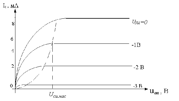 При повышении напряжения на стоке выходной ток возрастает, но при этом уменьшается толщина канала по его длине и возрастает сопротивление, поэтому зависимость Ic от Uси нелинейна, постепенно замедляется рост тока. Когда Uси достигает напряжения насыщения Uси.нас, прекращается рост тока (по упрощенной теории). Горизонтальный участок выходной характеристики называется участком насыщения. Реальные характеристики в области насыщения имеют небольшой наклон. Чем больше запирающее напряжение на затворе, тем раньше наступает перекрытие канала: при меньшем Uси наступает насыщение, и ток насыщения Iс.нас оказывается меньшим.