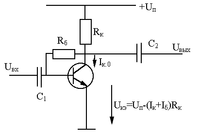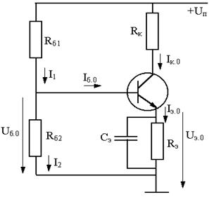 С увеличением (уменьшением) тока коллектора Iк, а следовательно и Iэ, возрастает (понижается) потенциал эмиттера Uэ.0, поэтому уменьшается (увеличивается) напряжение Uбэ = Uб.0 – Uэ.0, т.к. потенциал базы Uб.0 зафиксирован делителем напряжения Rб1, Rб2 . В результате ток покоя Iк.0 изменяется в меньшей степени. Чем больше Rэ и чем низкоомнее делитель в цепи базы, тем стабильнее каскад.