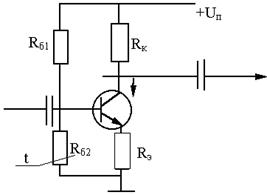 У терморезистора большой отрицательный ТКС – около 3% / град. Его можно включить в цепь без базового делителя, вместо Rб2:
