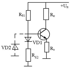 | VD1 - для компенсации сдвига входной характеристики (DUбэ), а диод VD2 - для компенсации изменения обратного тока DIкб.0. В интегральных схемах для термокомпенсации вместо диода включают эмиттерный переход транзистора. | ||