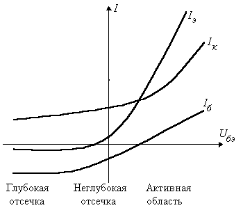 Между состоянием глубокой отсечки и открытым состоянием находится промежуточная область неглубокой отсечки, когда напряжение Uбэ близко к нулю.
