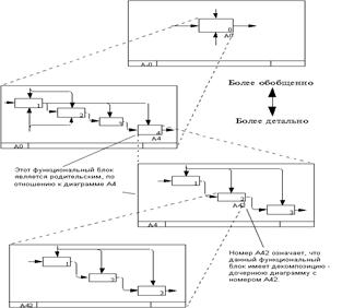 В процессе декомпозиции, функциональный блок подвергается детализации на другой диаграмме. Получившаяся диаграмма второго уровня называется дочерней (Child diagram), соответственно дочерний блок (Child Box). Блок - предок называется родительским блоком (Parent Box), а диаграмма – родительской диаграммой (Parent Diagram). Случается необходимость избавиться от отдельных “концептуальных” интерфейсных дуг и не детализировать их глубже некоторого уровня. Для решения подобных задач в стандарте IDEF0 предусмотрено понятие туннелирования. Обозначение “туннеля” (Arrow Tunnel) в виде двух круглых скобок вокруг начала дуги обозначает, что эта дуга не была унаследована от родительского блока и появилась (из “туннеля”) только на этой диаграмме, аналогично, обозначение вокруг конца (стрелки) дуги.