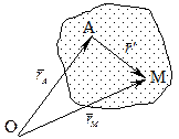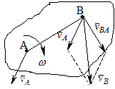 - относительная скорость точки M при вращении тела относительно полюса A, определяется как произведение угловой скорости тела на расстояние от точки до полюса