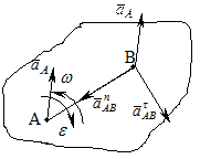 Ускорение любой точки в сечении тела, совершающем плоское движение, определяется как геометрическая сумма ускорений полюса и ускорения точки в ее вращении вместе с телом по отношению к полюсу.