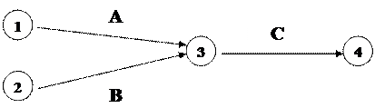 Простейший стрелочный граф изображен на рисунке 6.1. На нем для обозначения операции используется буква А, а для событий – цифры 1 и 2. События принято нумеровать таким образом, чтобы номер предшествующего события был меньше, чем номер последующего. Событие не считается свершившимся, если не завершены все операции, отвечающие стрелкам, входящим в обозначающий его узел. Так, на рисунке 14.2 отображена схема проекта, в котором операция С не может начаться ранее момента завершения операций А и В.
