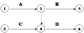 Если некоторые события непосредственно не связаны между собой реальными общими операциями, но в силу причин содержательного характера не могут произойти одно без другого, то для описания их отношений используют фиктивные логические операции. Фиктивным операциям приписывается нулевая продолжительность. Например, если операция В непосредственно зависит от операции А, а D – от С, но D также нельзя начать, пока не закончена А, то данный проект может быть описан с помощью графа, показанного на рисунке 14.3.