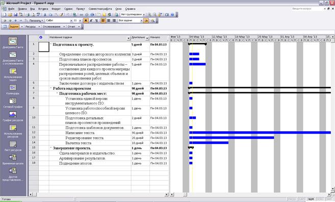 Слева расположена панель, на которой размещены ярлыки, используемые для вывода на экран различных представлений (views) информации о проекте. Наиболее часто используемое представление – так называемая диаграмма Ганта (Gantt chart). Собственно диаграмма размещена в правой части окна и представляет собой изображение календарного графика выполнения задач. В центре окна размещена таблица, похожая на таблицу Excel, которая содержит иерархическое описание задач и их длительность (Рисунок15.1).