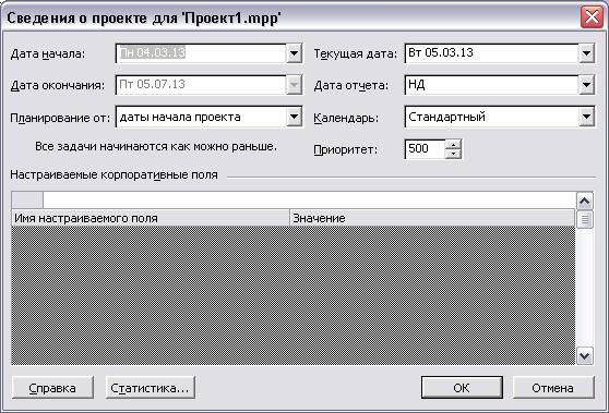 Каждый план проекта представляет собой файл с расширением. mpp. Чтобы создать такой файл, нужно запустить Project. Первоначально в окне Project таблица будет пуста. Первое, что необходимо сделать, это определить дату начала проекта. Для этого необходимо выполнить команду Project > Project Information. Появится соответствующее диалоговое окно (Рисунок15.2).