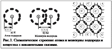Рассмотрим схематическое строение атома и молекулы водорода, рис.1. Электроны при движении по орбитам чаще находятся между ядрами, что способствует сближению атомов. Радиус атома водорода равен 0,53 ангстрема, а расстояния между ядрами атомов в молекуле водорода равняется всего лишь 0,74 ангстрема.