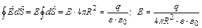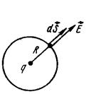 В качестве примера найдем напряженность поля, создаваемого точечным зарядом в точке, удаленной на расстояние R от заряда. Через заданную точку проведем сферу с радиусом R и центром в точке расположения заряда q. Вектор, изображающий элемент поверхности сферы dS перпендикулярен поверхности сферы и по направлению всегда совпадает с вектором напряженности электрического поля E. Если учесть, что напряженность поля E одинакова во всех точках сферы, то E как константу можно вынести за знак интеграла:
