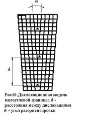 Уменьшение расстояния между решеточными дислокациями (d) в малоугловых границах ведет к увеличению угла разориентировки (q) на границе q = 2 arctg(b/2d), или q» b/d (рис.19).
