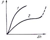 При испытании на сжатие машина может зафиксировать первичную диаграмму сжатия - зависимость усилия Р от уменьшения высоты образца (абсолютной деформации) Δh. Вид диаграммы сжатия различен для материалов, разрушающихся (рис.4.1) и не разрушающихся (рис.4.2) в результате испытания. В отличие от испытаний на растяжение, при сжатии удается разрушить далеко не каждый материал. Достаточно пластичные металлы и сплавы при сжатии расплющиваются в тонкие пластины и не разрушаются при максимально возможных усилиях испытательной машины.