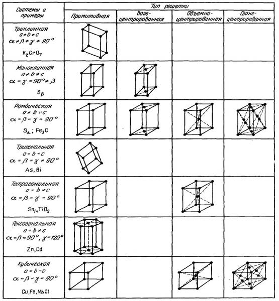 В кристаллографии рассматривают 14 типов элементарных ячеек. Их называют пространственными решетками Бравэ. Для характеристики элементарной ячейки задают шесть величин: три ребра ячейки а, Ь, с и три угла между ними. Эти величины называются параметрами элементарной ячейки (кристаллической решетки). Все 14 решеток Бравэ распределены по семи кристаллическим системам (сингониям) в соответствии с ориентацией и относительными величинами параметров решетки (рис. 12). Каждая кристаллическая система включает одну или несколько типов пространственных кристаллических решеток. В простой решетке атомы располагаются только по вершинам решетки, в объемноцентри-рованной еще один атом в центре решетки, в гранецентрированной еще по одному атому в центре каждой грани, и в базоцентрированной еще по одному атому в центрах пары параллельных граней.