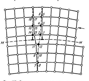 Однако в действительности сдвиг распространялся постепенно. В каждой момент времени в нём участвовали не все атомы по обе стороны от плоскости скольжения, а только те, которые находились в области дислокации, вокруг края экстраплоскости. Происходило поочерёдное, эстафетное перемещение атомов на расстояние меньше межатомного, в результате чего дислокация скользила на большие расстояния через весь кристалл. Если при одновременном сдвиге верхнеё части кристалла по отношению к нижнеё необходимо преодолеть все межатомные связи между всеми граничными атомами вдоль плоскости скольжения, то при перемещении дислокаций в соседнее положение разрываются межатомные связи только между двумя цепочками атомов (между 11 и 13). Именно этим объясняется низкое опытное значение критического скалывающего напряжения.