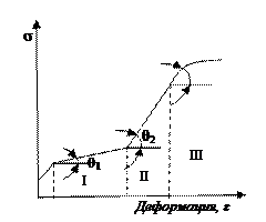 Рассмотрим упрочнение ГЦК монокристаллов на примере типичной кривой напряжение – деформация. На этой кривой четко выражены три стадии деформации.