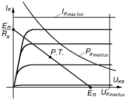 Наиболее экономичным с точки зрения затрат энергии является ключевой режим работы транзистора, так как рабочая точка (см рис.) проходит по нагрузочной прямой почти мгновенно, и допускается превышение максимально допустимых значений в 1,5¸2 раза, а так как мощность рассчитывается по формуле