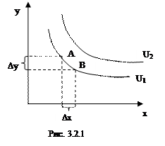 Предельной нормой замещеия (MRS) называется количество блага у, которое должно быть сокращено в обмен на увеличение блага х на единицу с тем, чтобы полезность набора осталась прежней: