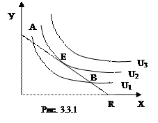 Потребитель, опираясь на свои предпочтения при заданном бюджете и ценах, пытается определить какое количество каждого благ следует купить. Для рационального потребителя это означает, что необходимо максимизировать общую полезность при условии бюджетного ограничения. Данный выбор можно изобразить графически. Используя кривые безразличия и бюджетную линию (R):