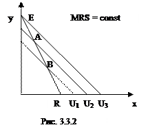 В точке (Е) MRS равно обратному соотношению цен товаров: MRSху = Рх/Ру.