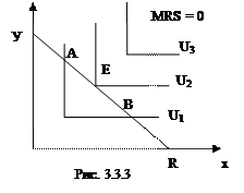 Равновесие потребителя имеет место на одной из осей в вершине угла, образуемого бюджетной линией (в точке Е). Другими словами – потребитель воздерживается от покупки блага х и все ресурсы направляет на покупку блага у.