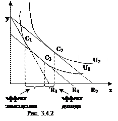 Проведем R3 параллельно R2 так, чтобы R3 касалось U1. Точка C3 разделит эффект замещения и эффект дохода.