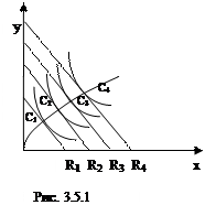Если одновременно снижается Рх и Ру, то это означает увеличение реального дохода потребителя и равномерное смещение бюджетной линии вправо. С1, С2, С3, С4 - параметры рыночного равновесия при различных уровнях дохода. Соединив их, получим линию «доход-потребление».