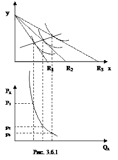 R1 – бюджетная линия, С1 – равновесие потребителя. Если снижается Рх, то R1 движется против часовой стрелки к R2; С2 – точка нового потребительского равновесия.
