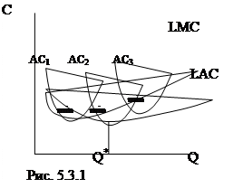 Кривая долгосрочных издержек (LAC) представляет собой огибающую кривых краткосрочных средних издержек производства и отражает эффект масштаба.