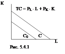 Изокоста имеет угловой коэффициент, равный отношению цен факторов производства, взятому с отрицательным знаком (- РL/РK). Это следует из уравнения изокосты: К = TC/PK – (РL / РK) × L.