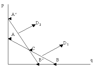 Так в т. С, относящейся к кривой спроса D1 (рис. 4-3), эластичность спроса по цене выше, чем в той же точке, относящейся к кривой спроса D2, поскольку ВС/АС>В¢С/А¢С.