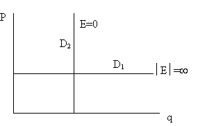 Эластичность во всех точках на кривой спроса D1 бесконечно велика по модулю. Эластичность во всех точках на кривой спроса D2 равна нулю.