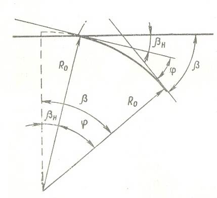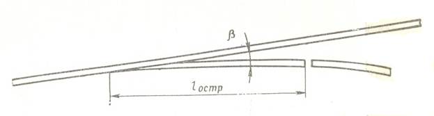 В стрелках с криволинейным остряком секущего типа остряк примыкает к рамному рельсу под начальным углом βн, образующимся при теоретическом пересечении рабочей грани рамного рельса с рабочей гранью криволинейного остряка. Стрелочный угол β при этом образован рабочей гранью рамного рельса и касательной к рабочей грани остряка в его корне. βн<β, что обеспечивает более плавный вход состава на боковой путь, несколько сокращает длину стрелочного перевода. Такая стрелка является типовой.