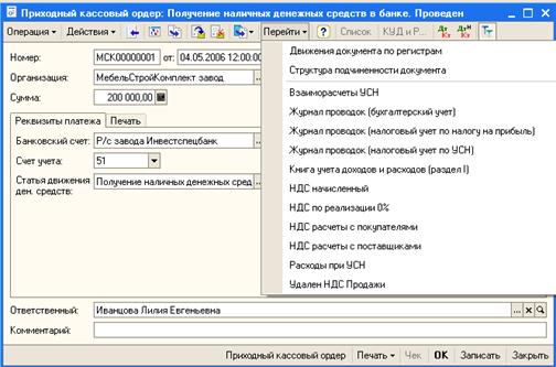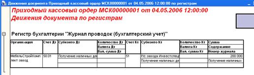Форма документа, предусматривающая проведение содержит кнопку «Перейти». Эта кнопка открывает меню- список названий учетных регистров, в которых могут быть сформированы записи документом. С помощью пункта «Движение документа по регистрам» выводится отчетная форма, отображающая результат проведения документа по всем регистрам (сведений, накопления, бухгалтерии)