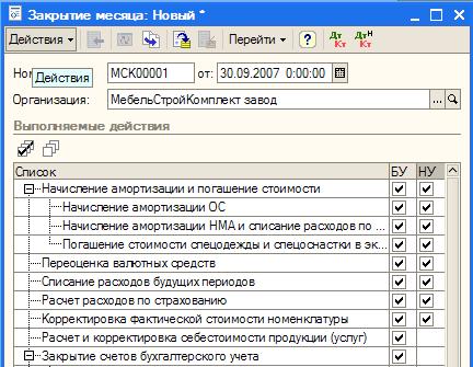 Данная процедура выполняется документом «Закрытие месяца». Форма документа содержит иерархический список регламентных операций