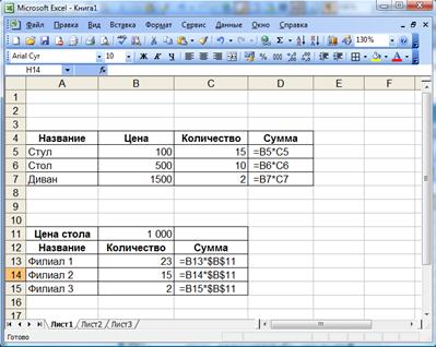 При копировании формулы, содержащей относительные ссылки, и вставке ее в другое место ссылки будут меняться, настраиваясь на новое местоположение (см. рис. 9.2). Если необходимо, чтобы ссылки не изменялись при копировании формулы в другую ячейку, используются абсолютные ссылки (см. рис. 9.2).