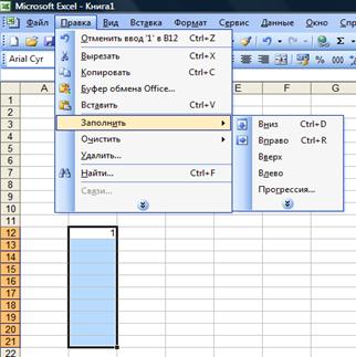Команды Правка – Заполнить – Вниз/Влево/Вправо/Вверх позволяют скопировать содержимое первой из выделенных ячеек во все остальные в заданном направлении (рис. 9.4.).