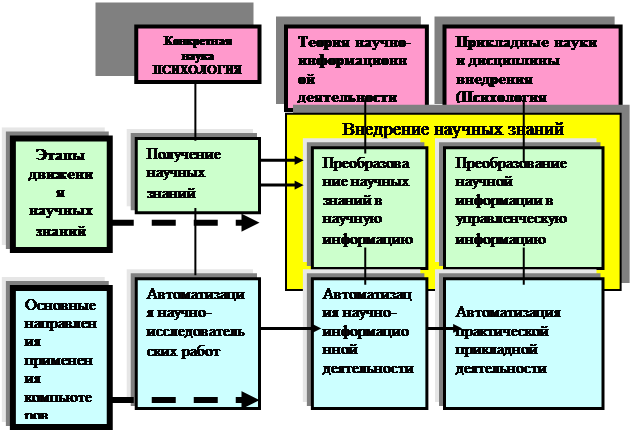 Множество подходов к проблематике автоматизации конкретных психологических исследований базируются на идее создания быстродействующих систем психодиагностики и психологии управления. Логика построения концептуальных схем автоматизации состоит в преобразовании проблем конкретной науки в информацию для использования ее на практике.