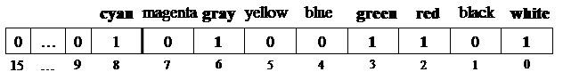 Элемент хранения объекта множественного типа должен допускать размещение 2 Power(Base_Type) значений. В качестве представления объекта множественного типа используется характеристическая функция, являющаяся массивом логических значений, i–я компонента которого означает наличие или отсутствие i-й константы базового типа в множестве. Каждая константа базового типа в представлении константы множественного типа имеет сопоставимый номер и занимает 1 бит, соответствующий ее порядковому номеру в базовом типе. Например, представление объекта [white, red, green, gray, cyan] в его элементе хранения выглядит следующим образом (рис.7):