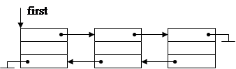 В двусвязном нециклическом списке первый узел не имеет предшественника (поле связи prev первого узла равно NIL), а последний узел не имеет последователя (поле связи next последнего узла равно NIL). На первый узел двусвязного списка, имеющего нециклическую структуру, указывает указатель first: pDlist. Выполнение условия first = nil означает, что двусвязный нециклический список пуст. Структура двусвязного нециклического списка представлена на рис. 33.