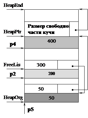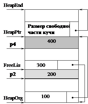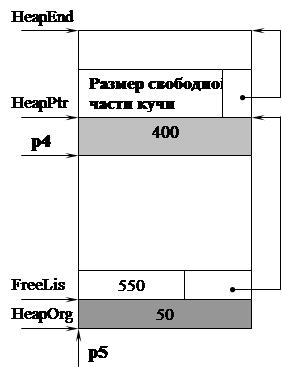 Рис. 46. Распределение области памяти кучи после выполнения запросов на освобождение / выделение памяти