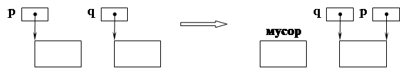 Мусором называются блоки памяти, доступ к которым во время выполнения программы оказался потерян, так что эти блоки больше не используются, но и не могут быть возвращены в кучу. Возникновение мусора иллюстрирует программный фрагмент и рис. 48.