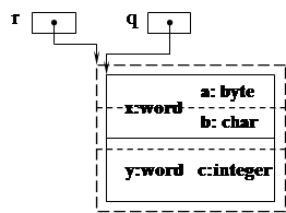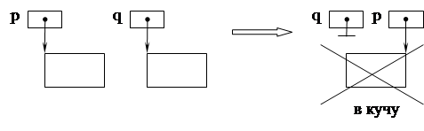 Через указатель q по-прежнему видна структура, соответствующая объекту типа Т1 с атрибутами х и у, ранее размещенному в том блоке памяти, который позже был зарезервирован для объекта типа Т2 с атрибутами а, в, с. Результат применения в программе висящей ссылки приводит к ошибкам, которые трудно обнаружить, поэтому висящие ссылки “опаснее” накопления мусора.