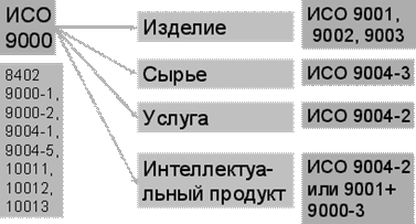 В настоящее время всемирное распространение получил комплекс стандартов на систему качества предприятия, разработанный ISO (International Standards Organization), точнее, техническим комитетом ISO/TC 176 (ИСО/ТК 176). Этот комплекс стандартов имеет общее название ISO 9000 (ИСО 9000). Структура ИСО 9000 показана на рисунке: