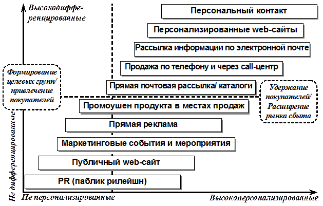 Наиболее эффективными методиками являются управление контентом и персонализированный маркетинг, имеющие целью обеспечить клиента информацией, наиболее соответствующей его специфическим запросам. При этом маркетинговые коммуникации рассматриваются как цикл – непрерывный процесс, построенный на обратной связи с рынком и основанный на постоянном уточнении задач и целей.