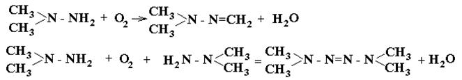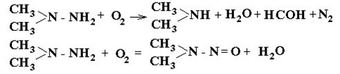 НЕСИММЕТРИЧНЫЙ ДИМЕТИЛГИДРАЗИН – компонент ракетного топлива – горючее. Температура кипения - 63С. Температура плавления –57С. Сильный восстановитель. Крайне ядовитое соединение, обладающее выраженными канцерогенными свойствами. Легко окисляется в воздухе с образованием ряда продуктов превращения: диметилгидразона формальдегида, тетраметилтетразена, диметиламина, диметилнитрозоамина и др.