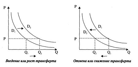 Трансферт (будем обозначать сумму трансферта Тr, от англ. tгаnsfer) можно рассматривать как налог с отрицательным значением платежа, поэтому его воздействие прямо противоположно рассмотренному ранее. Повышение субсидии снижает величину общей стоимости покупки. Введение субсидии приводит к росту спроса на товар, а ее отмена - к снижению спроса.
